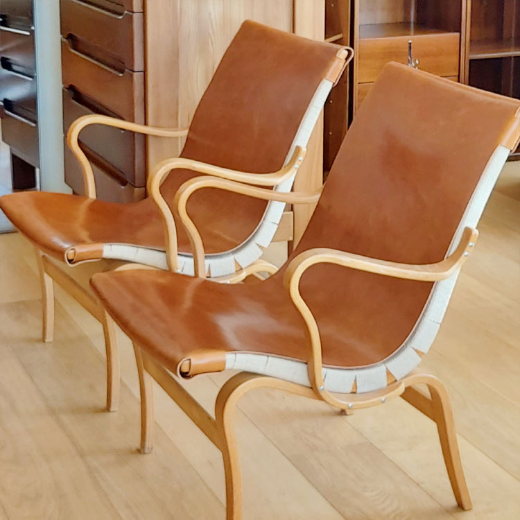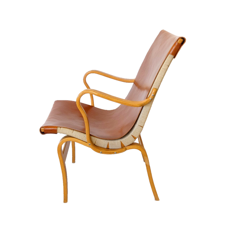브루노 맛손이 DUX를 위해 디자인한 1960년대 Eva 라운지의자입니다. 브루노 맛손은 가구에 유기적인 형태를 도입한 최초의 스칸디나비아 디자이너 중 한 명입니다. 지금 보시는 Eva 체어나 그의 또 다른 대표적인 Pernilla 시리즈와 같은 그의 작품에는 극적으로 흐르는 구부러진 프레임이 주요 특징입니다. 지금 보시는 제품은 기본 패브릭 웨빙 시트에 통가죽 커버가 입혀져 있어 탈부착이 가능합니다. 웨빙과 가죽커버, 우드프레임은 견고하나 웨빙에서 물얼룩 자국이 보입니다. 양털러그 또는 가죽커버를 활용하시면 사계절 색다른 무드로 연출하실 수 있습니다.